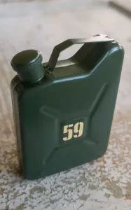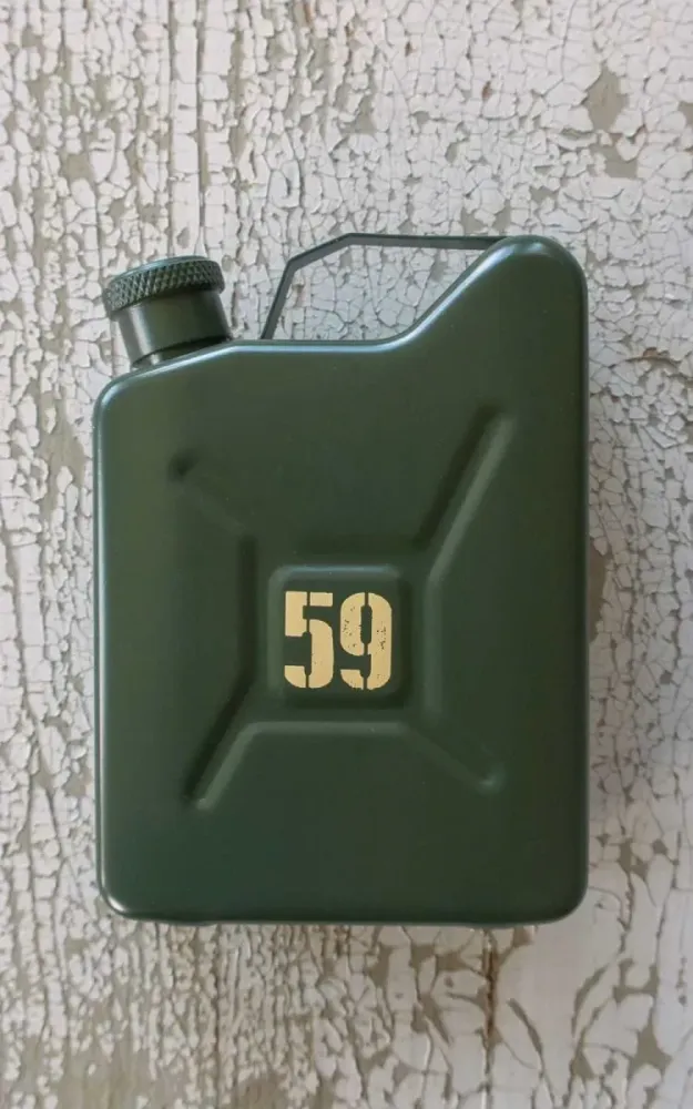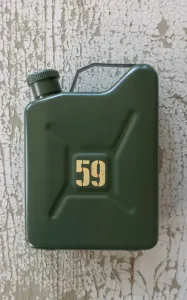 Denne lommeflasken, formet som en bensinkanne, er laget av rustfritt stål, slik at innholdet forblir lukt- og smaksnøytralt. Den rommer omtrent 148 ml (5 oz) av din favorittdrikk, som er sikkert oppbevart av den solide skrukorken. Takket være den praktiske størrelsen passer den perfekt i forskjellige lommer for en rask slurk på farten. Den matte olivenfargede finishen er dekorert med en kremfarget «59».