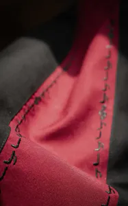 Skjorten er sort men har et cremefarget panel på høyre side med forskjellige noter brodert nedover.